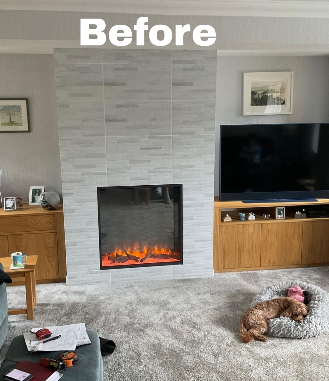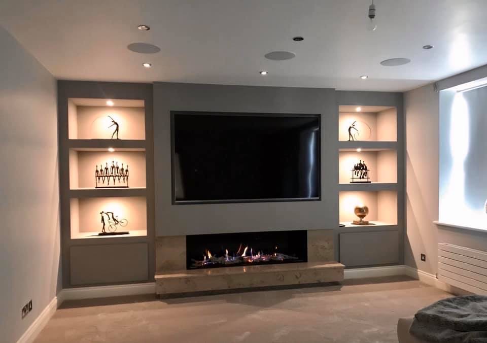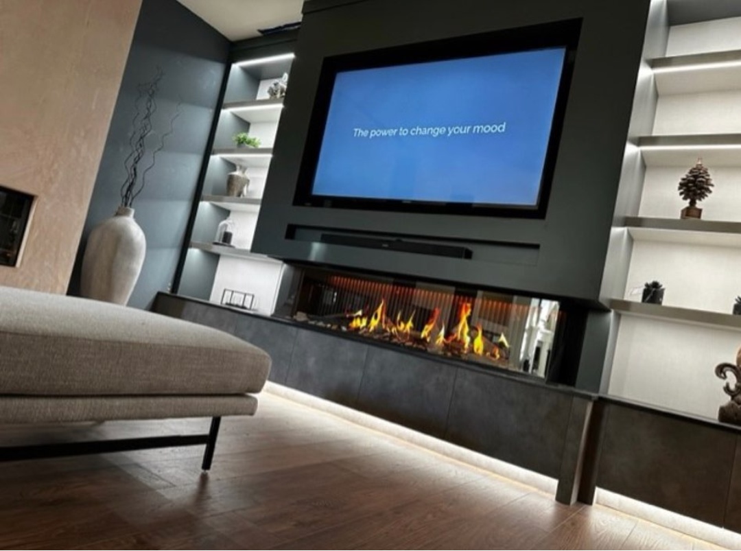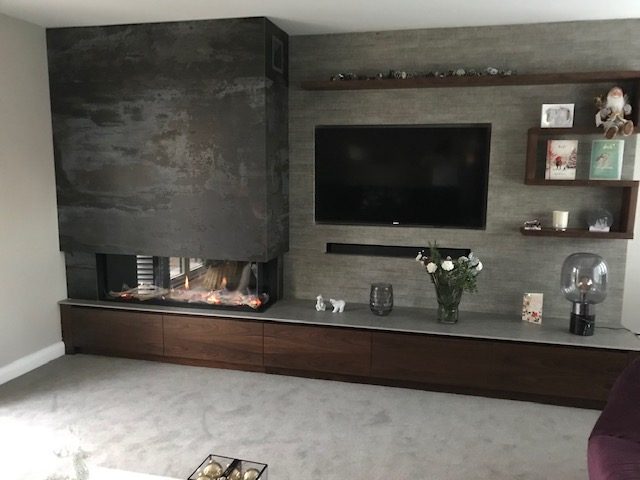 What a transformation with the fully designed feature cabinetry by Tom Maxwell and British Fires New Forest 1900 electric fire with the Deluxe real log fuel bed. Just another day at the office for the Tom Maxwell and Stonehouse Fireplaces teams creating stunning feature walls throughout Yorkshire