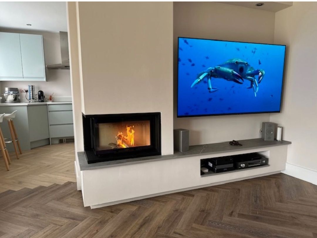 recent installation in York of a Contura i40 #woodburning cassette stove with left hand side glass and guillotine door. Full feature wall with lighting, TV and Dekton top.