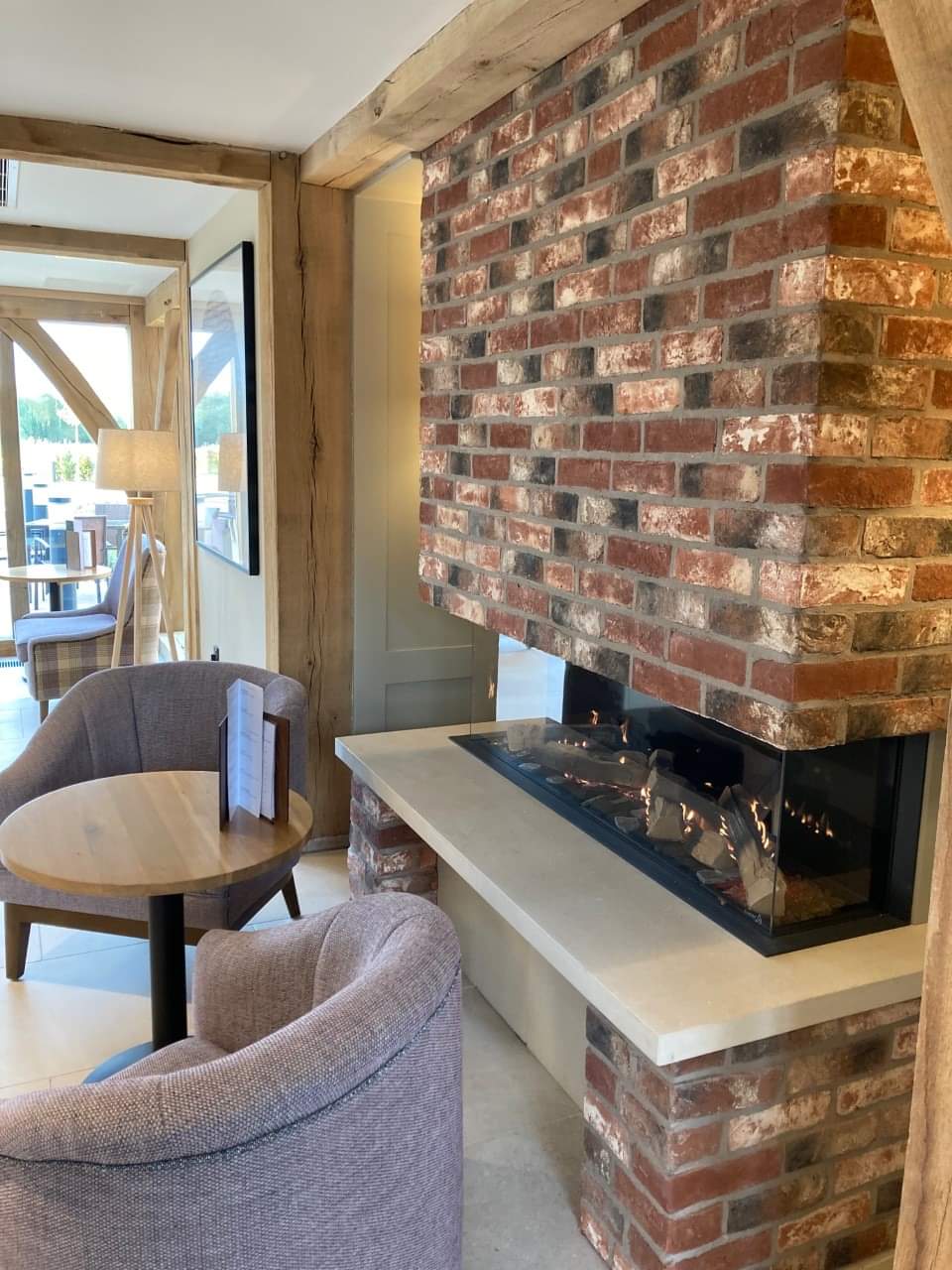 The fire is the Elements4 Summum 140S 3 sided gas fire with brick slips and a Bateig Stone base.