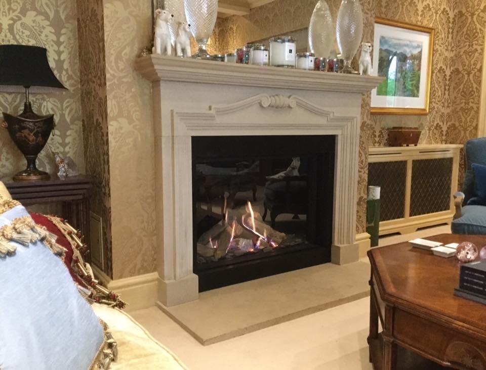 Large Limestone fireplace with efficient gas fire