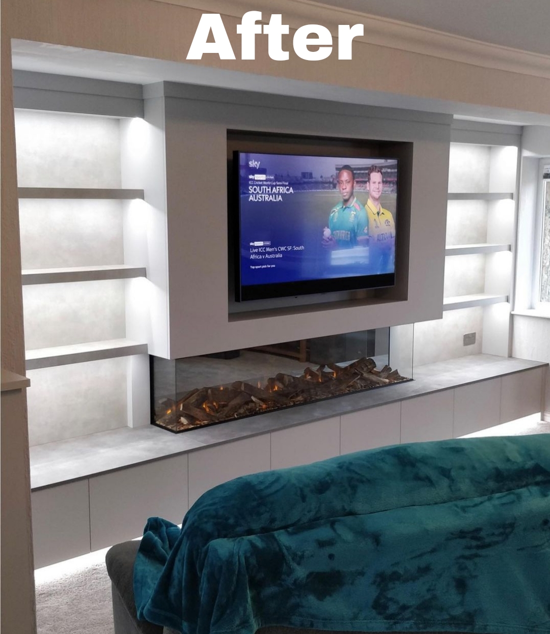 What a transformation with the fully designed feature cabinetry by Tom Maxwell and British Fires New Forest 1900 electric fire with the Deluxe real log fuel bed. Just another day at the office for the Tom Maxwell and Stonehouse Fireplaces teams